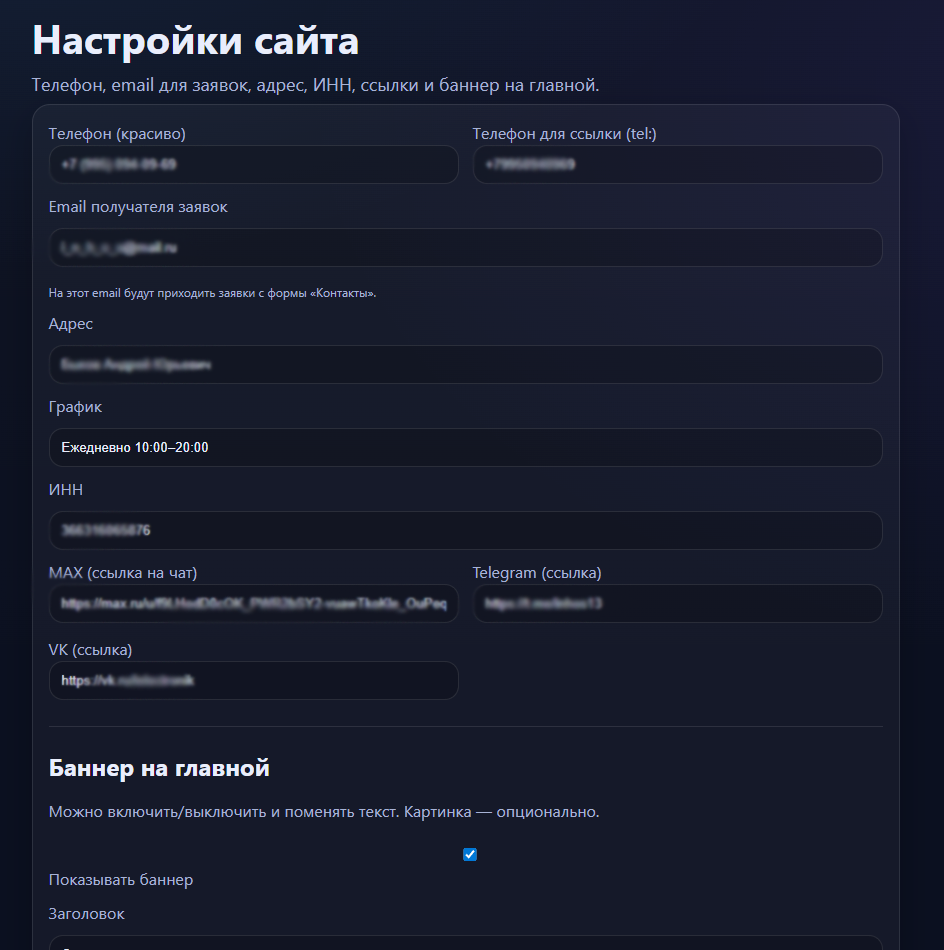 В результате получился универсальный сайт-шаблон для сервисного бизнеса с собственной админкой, который легко адаптируется под разные ниши и готов к масштабированию и коммерческому использованию.
