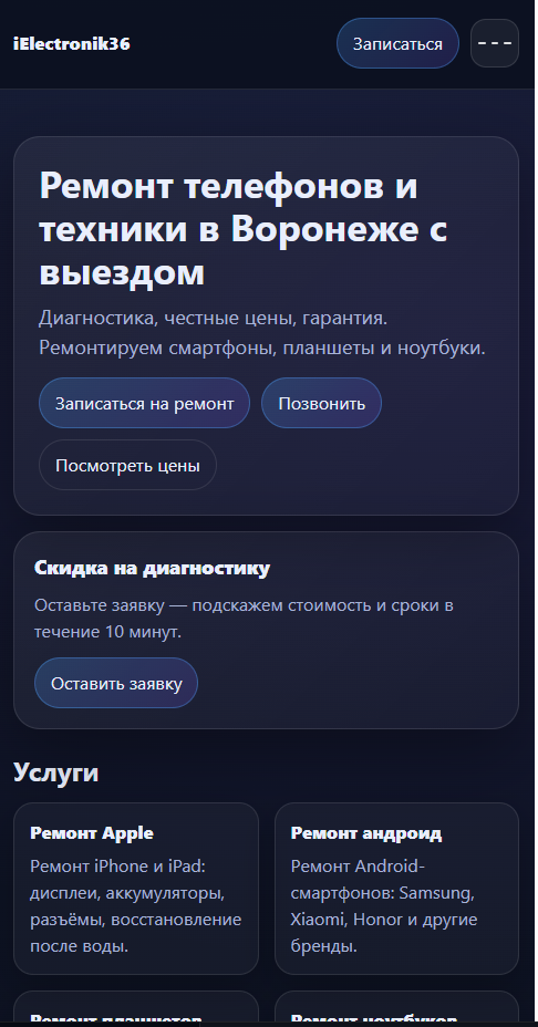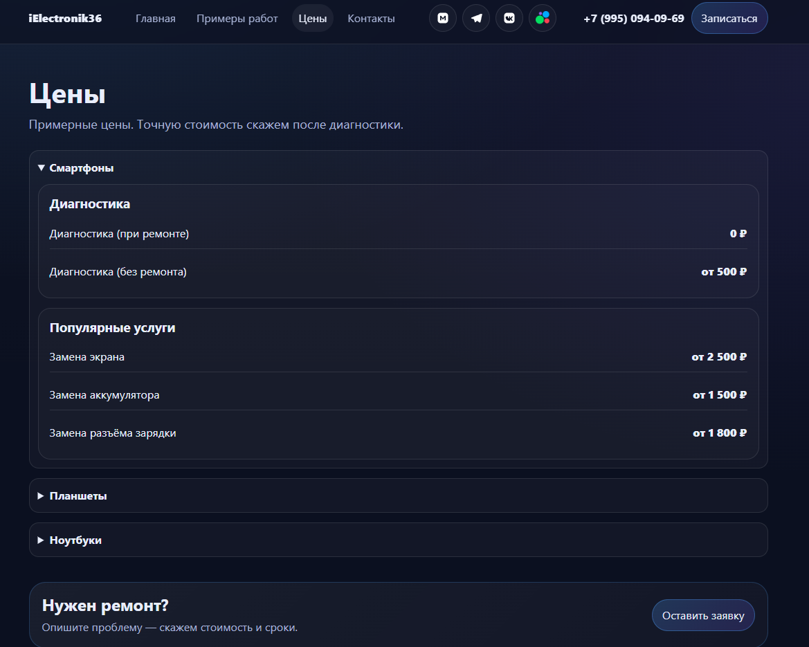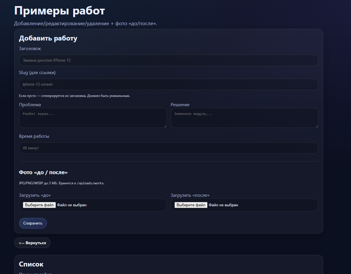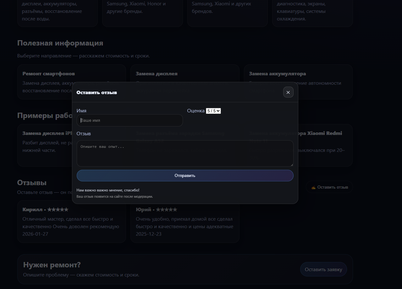 Проектирование и разработка универсального сайта для сервисного бизнеса (ремонт техники) с собственной админ-панелью управления. Решение создавалось как продукт — с возможностью масштабирования и продажи в виде готового шаблона.