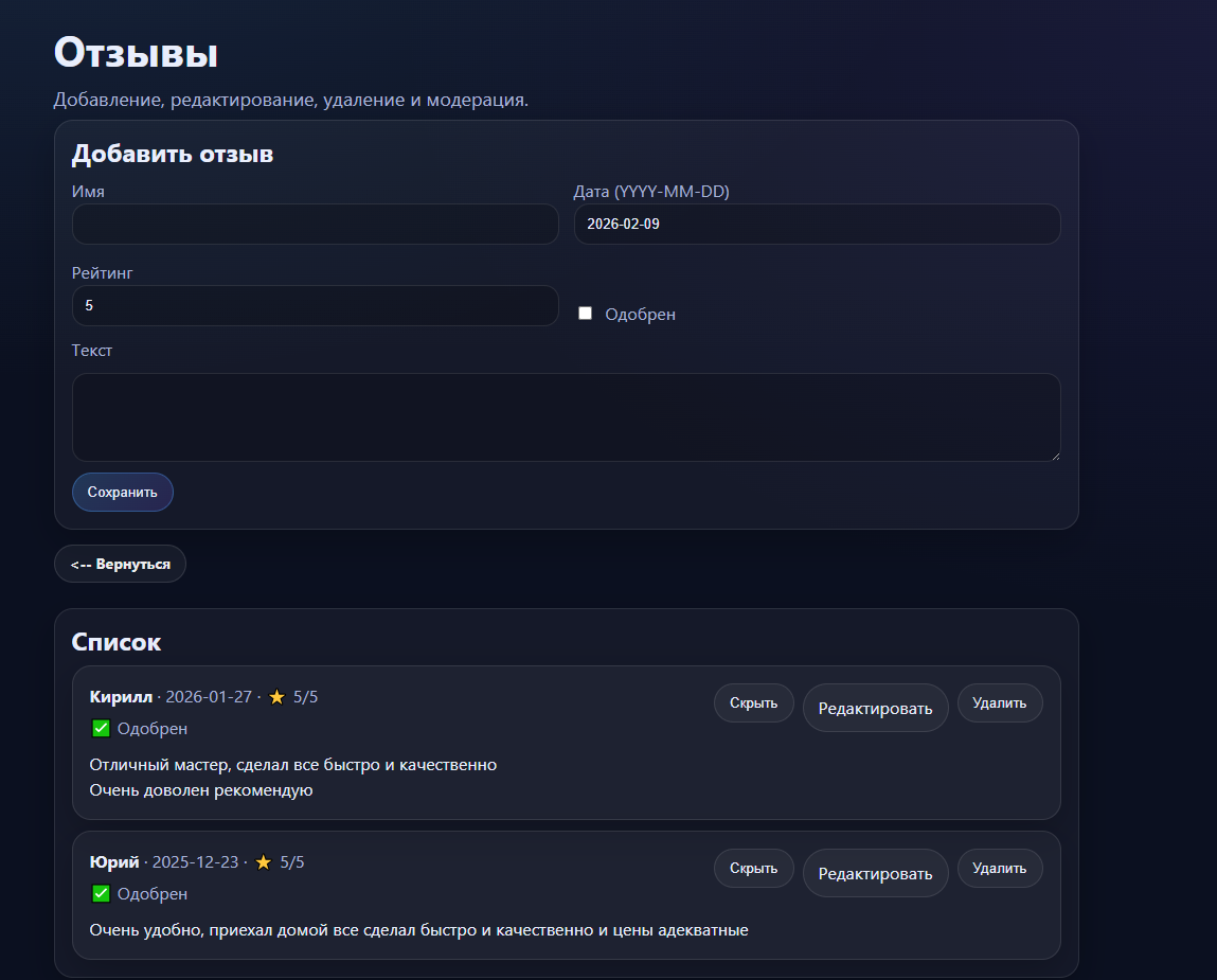 В результате получился универсальный сайт-шаблон для сервисного бизнеса с собственной админкой, который легко адаптируется под разные ниши и готов к масштабированию и коммерческому использованию.